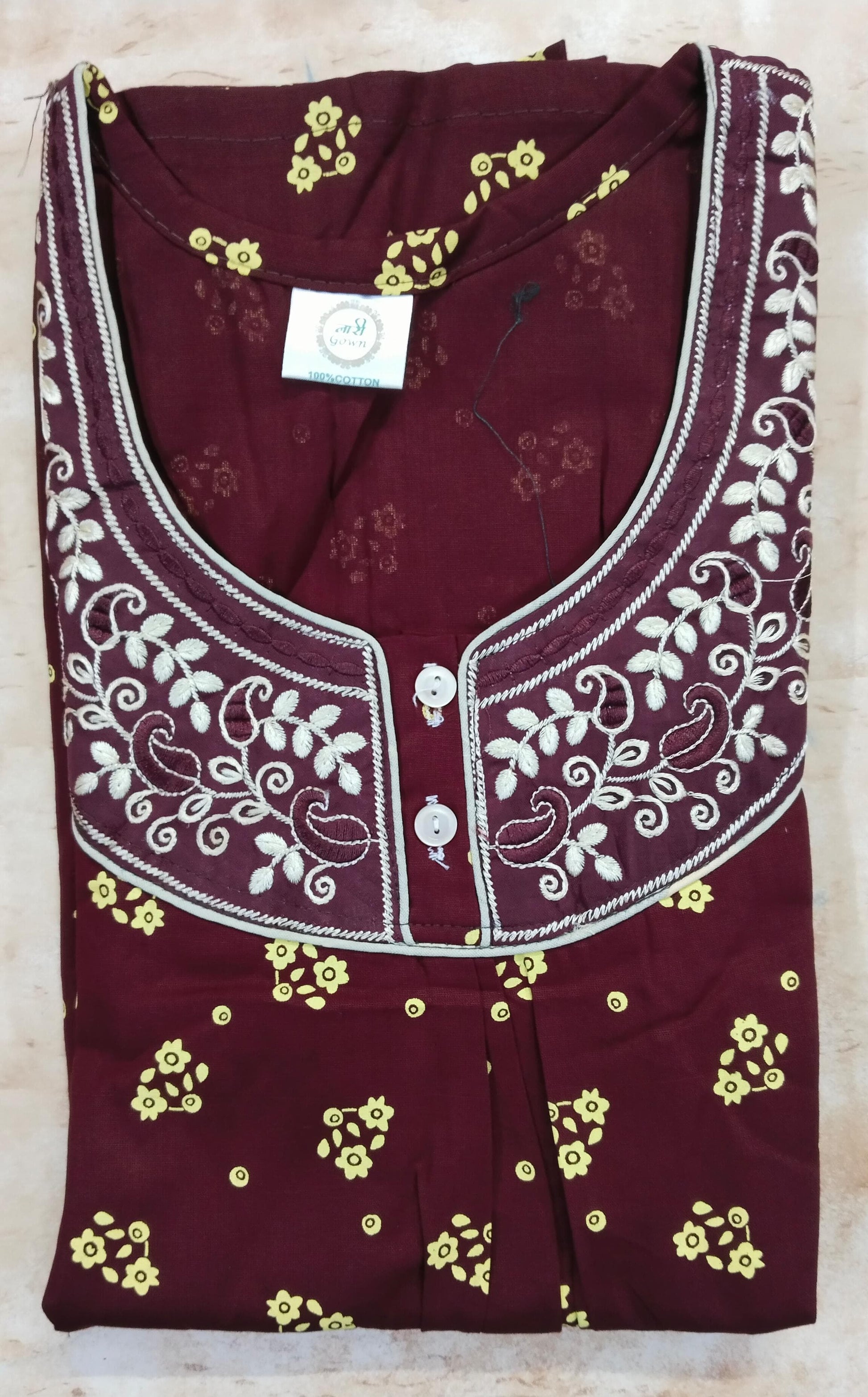 Experience timeless comfort with our Rangkara by Ankara pure cotton nighty. Featuring a rich maroon base adorned with delicate yellow floral prints and a beautifully embroidered neckline, this nightwear blends elegance and ease. Made from 100% breathable cotton, it’s perfect for daily wear, lounging, or a good night’s sleep.
